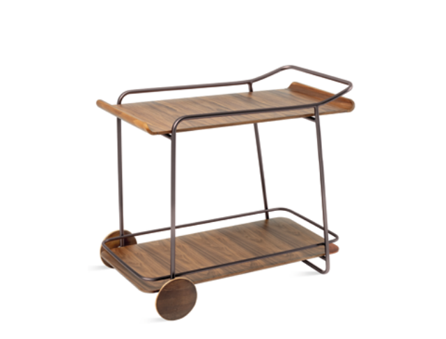Estrutura aço carbono Bandeja MDF revestido Detalhe rodas funcionais em madeira maciça Acabamentos da foto Nogueira | MT 05 Café